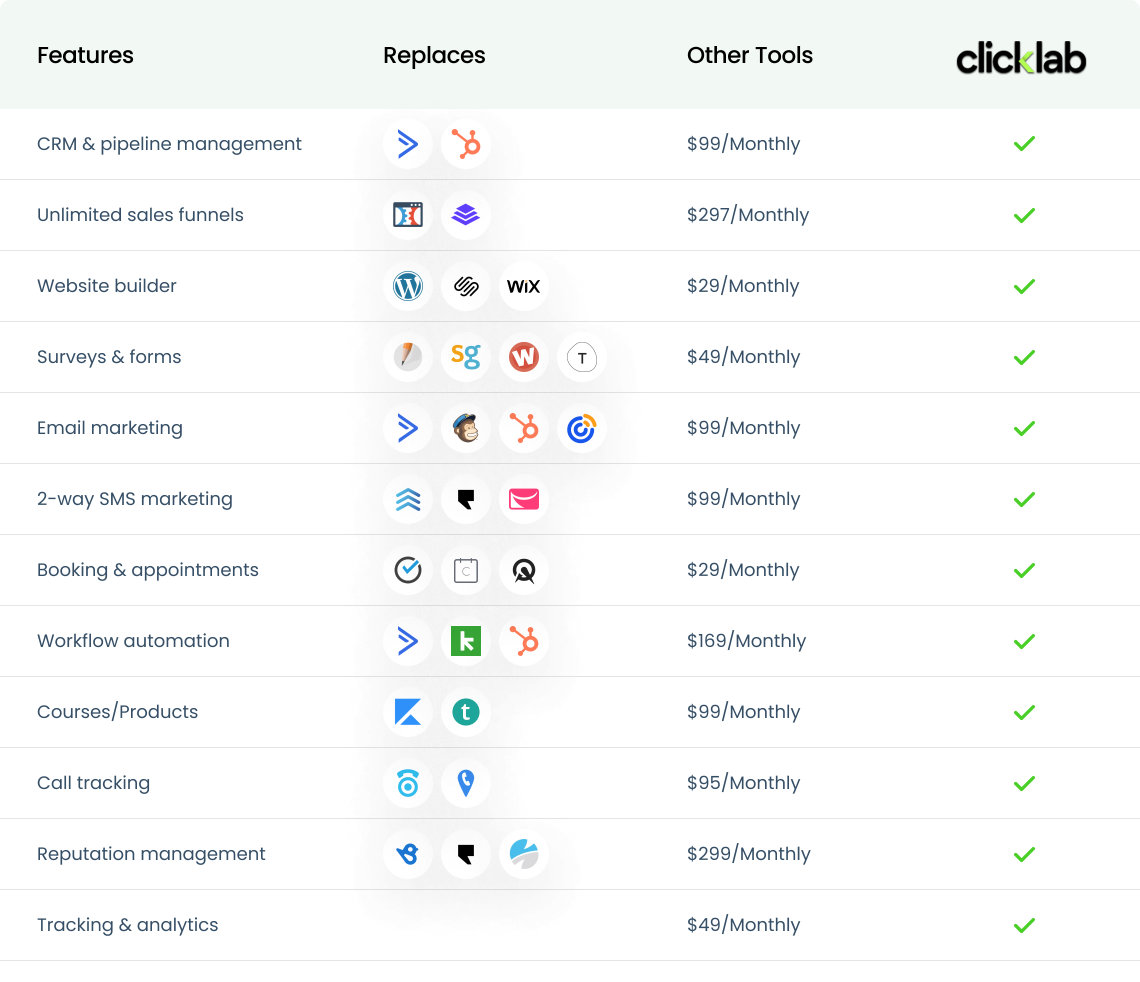 With Clicklab, you don’t need multiple subscriptions. Gain access to our all-in-one platform, Clicklab CRM, and consolidate everything you need to grow your business—at a fraction of the cost.